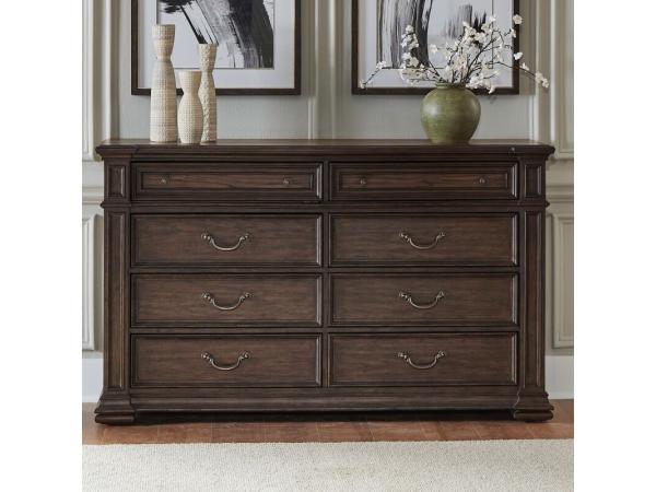 This 8-drawer dresser is crafted from rubberwood solids and hickory veneers with a Chateau Brown finish and antique brass hardware. It features serpentine-shaped top drawers, soft-closing guides, felt-lined top drawers, and cedar-lined bottom drawers.