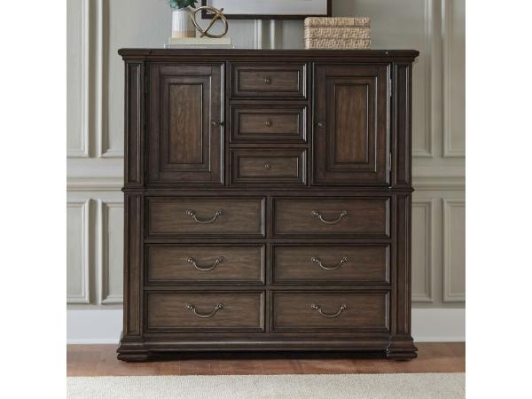 This 6-drawer chest is crafted from Rubberwood solids and Hickory veneers with a Chateau Brown finish. It features felt-lined top drawers for jewelry, a cedar-lined bottom drawer, and soft-closing drawer guides for smooth operation.