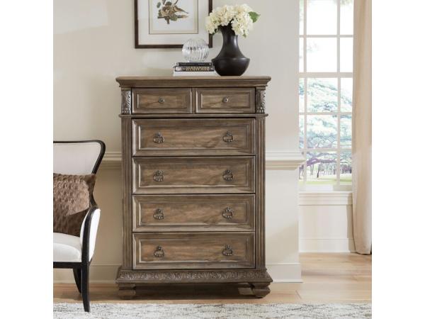 This luxurious 5-drawer chest is crafted from rubberwood solids and hickory veneers with a Chestnut finish. It features carved details, full extension drawers with felt and cedar lining, and antique brass hardware.