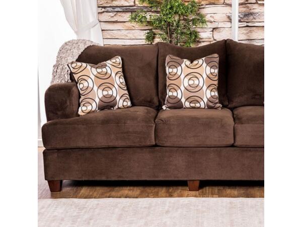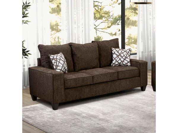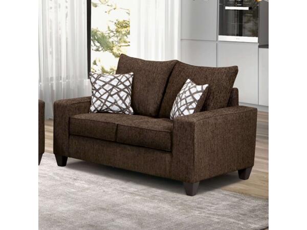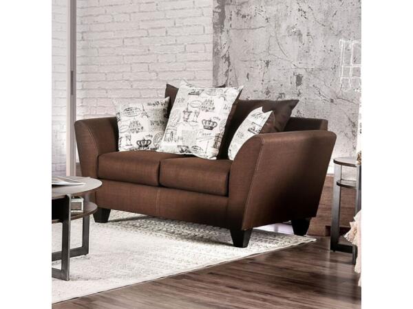The classic chocolate linen-like upholstery of this contemporary style sofa set makes it the perfect family piece. Smooth curved arms