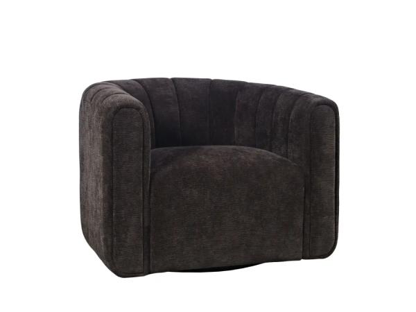 “The Grande Swivel Chair makes a bold statement with its curved barrel shape and channel-tufted back. while the fabric keeps