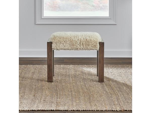 This console stool is crafted from Pine solids with a Cobblestone Brown finish and features square block legs. It offers a comfortable upholstered seat with luxurious faux sheepskin fabric and includes nylon glides to protect flooring.