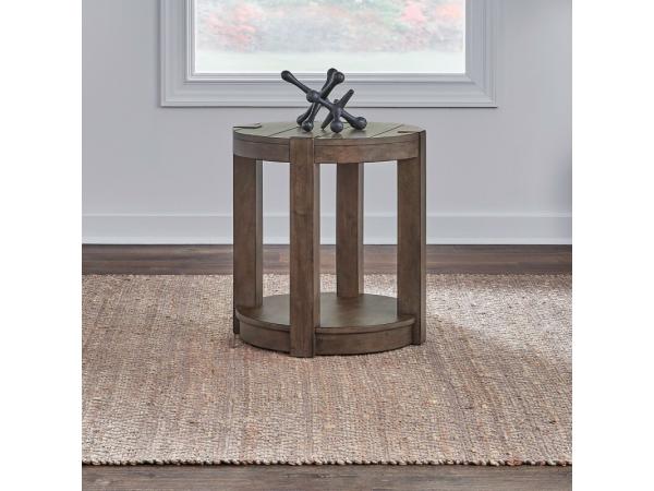 This round chairside table features Pine solids and Rustic Birch veneers with a Cobblestone Brown finish. It offers block raised legs, a planked top with a high-low veneer pattern, and an open bottom shelf for display.
