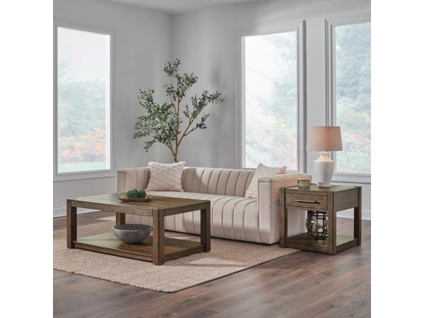 This end table, crafted from Pine solids and Rustic Birch veneers with a Cobblestone Brown finish, features a planked top with a high-low veneer pattern and block raised legs. It includes one interior storage drawer with Soft Wash Brass hardware and an op