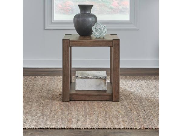 The square chairside table is crafted from Pine solids and Rustic Birch veneers with a Cobblestone Brown finish. It features block raised legs, a planked top with a high-low veneer pattern, and an open bottom shelf for storage.