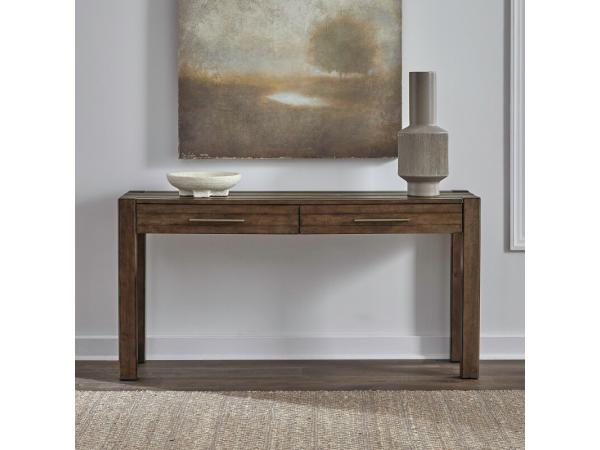 This console table features Pine solids with Rustic Birch veneers and a Cobblestone Brown finish. It has a planked top with a high-low veneer pattern, block raised legs, and two interior storage drawers with Soft Brass Wash hardware.