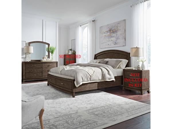 Queen Storage Footboard w/ Slatroll,Queen Panel Headboard,Storage Bed Rails,6 Drawer Dresser,Arched Mirror,5 Drawer Chest