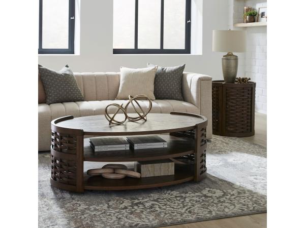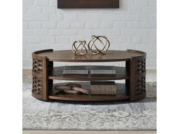 This oval cocktail table combines mobility and storage, featuring casters, a fixed middle shelf, and an open bottom shelf. Its design is highlighted by curved end panels with a distinct basketweave pattern.