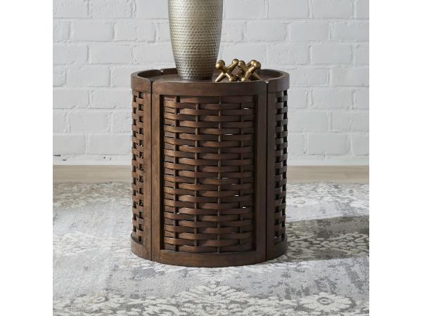 This fully enclosed round end table offers a clean, contained look with soft shaping. Its design is distinguished by curved raised end panels featuring a basketweave pattern.