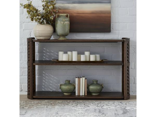 This sofa table features a soft oval shape with two tiers of open storage on a fixed center shelf and a bottom shelf. The design includes curved end panels with a decorative basketweave pattern.