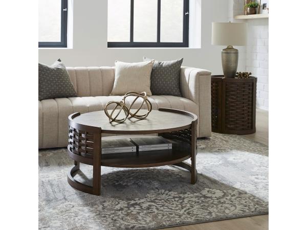 This round cocktail table features soft shaping and includes a bottom shelf for storage and display. It is designed with curved raised end panels that have a decorative basketweave pattern.