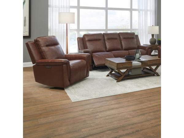 The Avery swivel glide recliner in Cognac leather features dual power recline with an articulating headrest and Dacron wrapped foam core seats. It offers comfort and convenience with USB-A and USB-C charging ports.