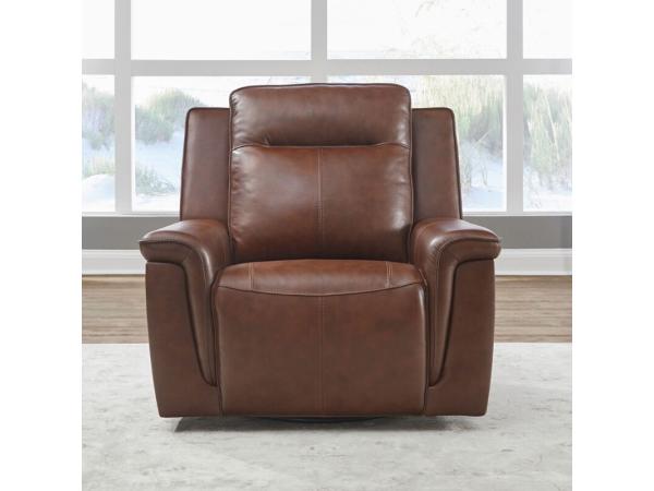 The Blair swivel glide recliner in Cognac leather offers dual power recline with a power articulating headrest and bucket seating for enhanced comfort. It features a swivel glide base for easy movement and includes USB-A and USB-C charging ports.