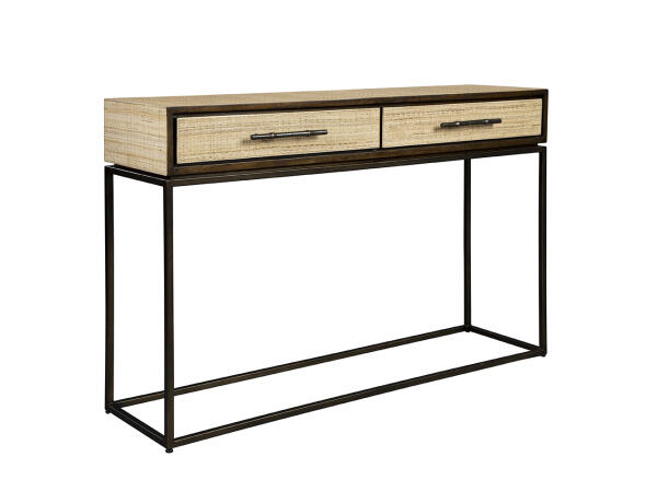 Lily’s Console is crafted from sustainably grown mahogany and elegantly wrapped in natural raffia for a textured, organic look. Two