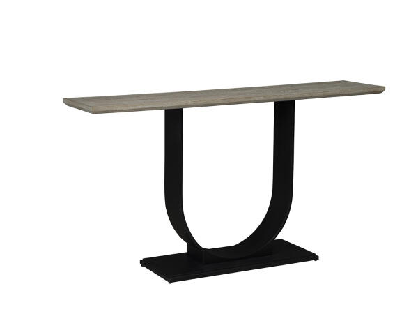Long and narrow, this slender console is crafted of oak and mahogany and boasts a distressed gray finish. The lower