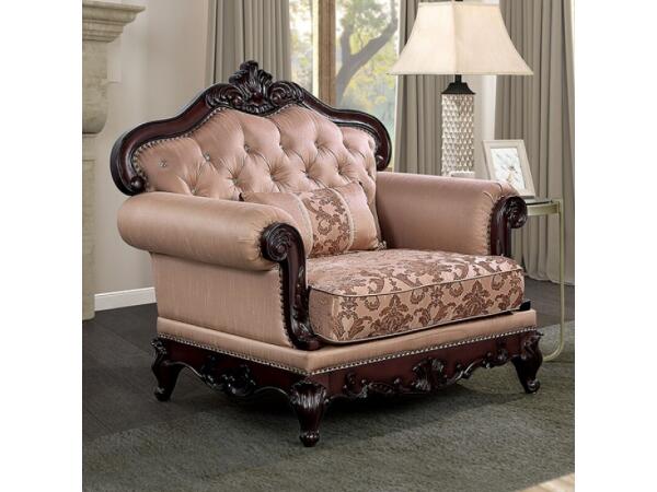 Product Details Style Traditional Color/Finish Dark Cherry/Light Brown Material Fabric, Solid Wood, Others Frame Finish Dark Cherry Upholstery Color Light