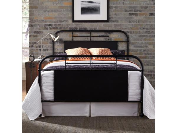This Vintage Series full metal bed in antique black features a metal tube construction with a distressed finish. It includes a headboard and footboard with turned spindles, suitable for cottage to farmhouse bedroom styles.