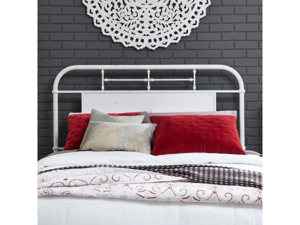 This King metal headboard is crafted from metal tube with an antique white distressed finish, featuring a shaped cap rail and turned spindles. It works with a metal bed frame, ideal for cottage to farmhouse decor.