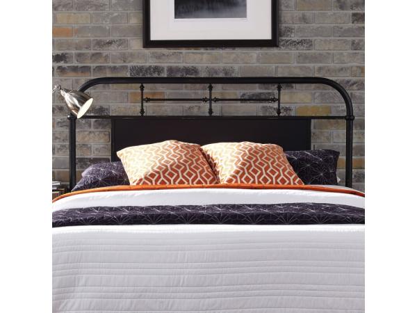 This King metal headboard is crafted from metal tube with a black distressed finish, featuring a shaped cap rail and turned spindles. It works with a metal bed frame, ideal for cottage to farmhouse decor.