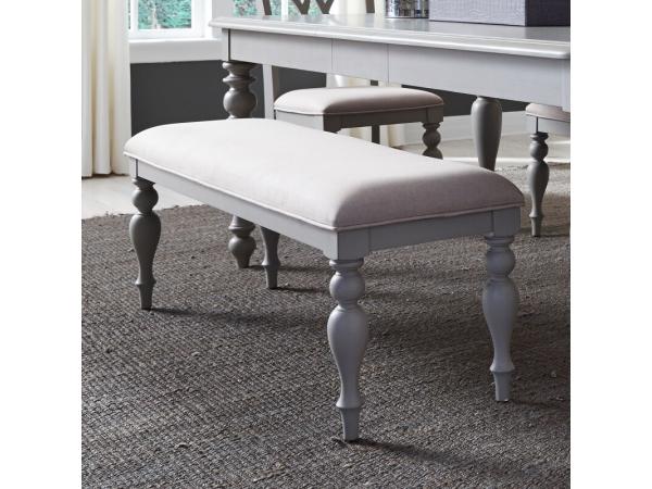 A stylish accent bench upholstered in linen fabric, featuring elegant turned legs. Nylon chair glides are included to protect floors.