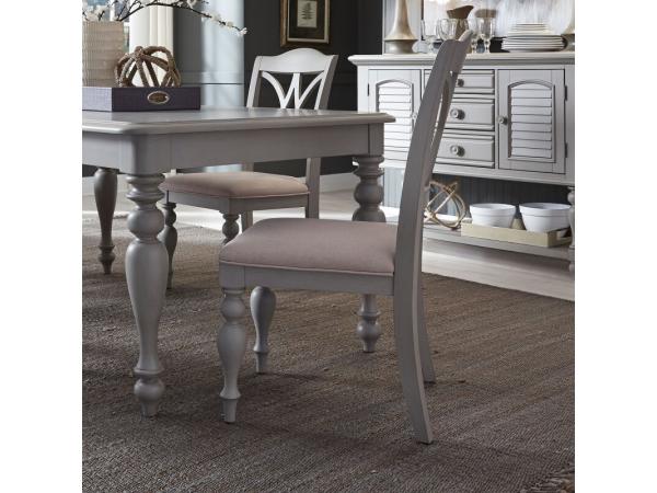The Summer House Splat Back Side Chair is crafted from poplar and rubberwood solids with a dove grey finish. It features grey linen upholstery, nylon chair glides, and decorative backs with round turned legs.