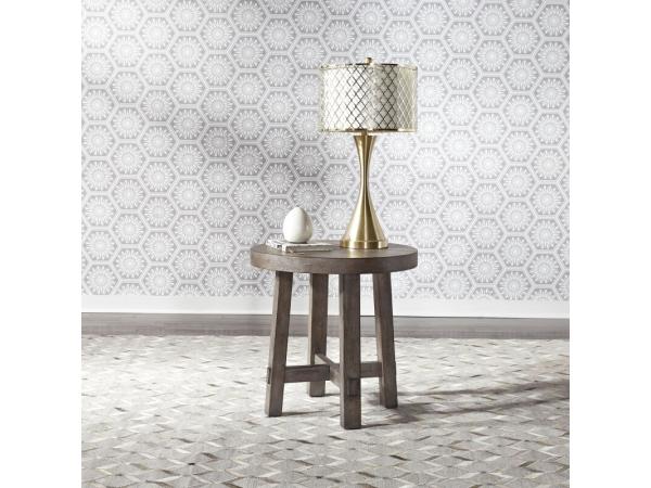 The Modern Farmhouse splayed leg round end table is made of poplar solids with knotty white oak veneers, showcasing a dusty charcoal finish with heavy distressing. It features a high-low planked top and splayed legs, suitable for cottage or contemporary s