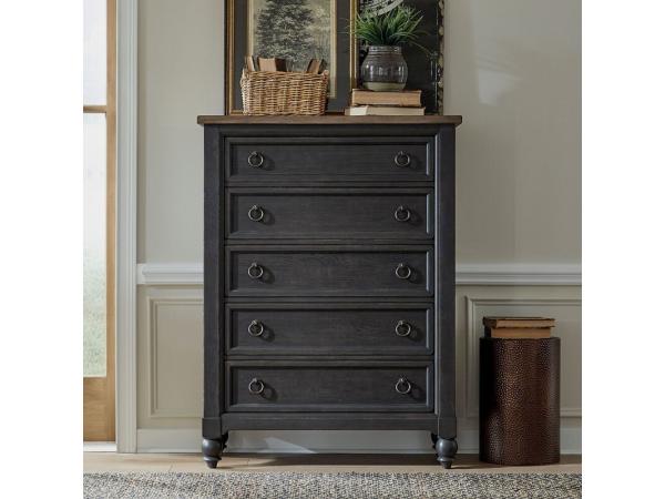 This Americana Farmhouse 5-drawer chest combines a black and dusty taupe finish with antique brass hardware. It features French/English dovetail construction, full extension glides, and felt-lined top and cedar-lined bottom drawers.