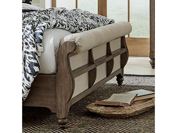 This King sleigh headboard features a beautiful tufted linen fabric upholstery with nail head trim and a rolled top panel. It is crafted from poplar solids and white oak veneers.