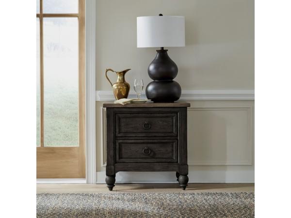 This Americana Farmhouse 2-drawer nightstand features a dusty taupe finish and antique brass hardware. It includes a convenient charging station with two power outlets and two USB ports, along with felt-lined top and cedar-lined bottom drawers.