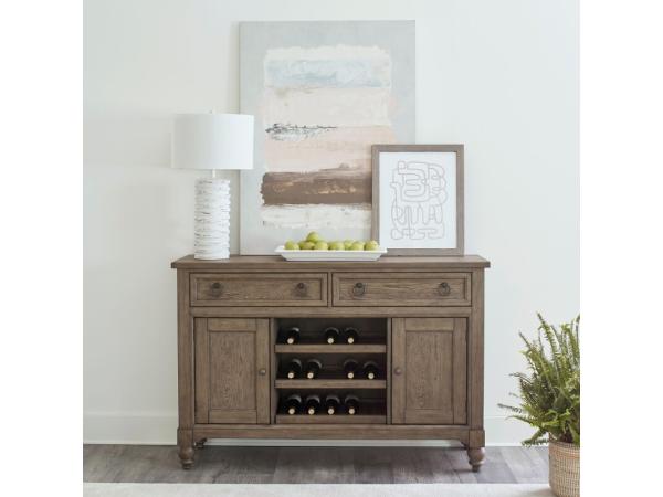 This Americana Farmhouse buffet is crafted from rubberwood solids with white oak veneers and a Dusty Taupe finish. It includes felt-lined drawers, two doors with adjustable shelves, and reversible center shelves for wine storage or display.