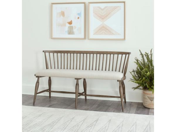This Americana Farmhouse upholstered Windsor bench is made of rubberwood solids with a Dusty Taupe finish. It features a curved Windsor back, a padded Stone Buff Linen seat, splayed legs, and nylon glides for floor protection.