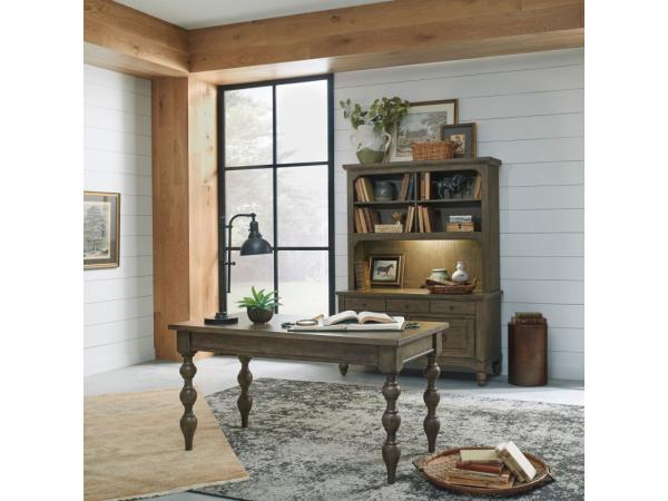 The Americana Farmhouse writing desk features a distressed dusty taupe finish over poplar solids and white oak veneers, accented with heavy turned legs. It includes three full extension drawers with bead molding and antiqued brass knob hardware.