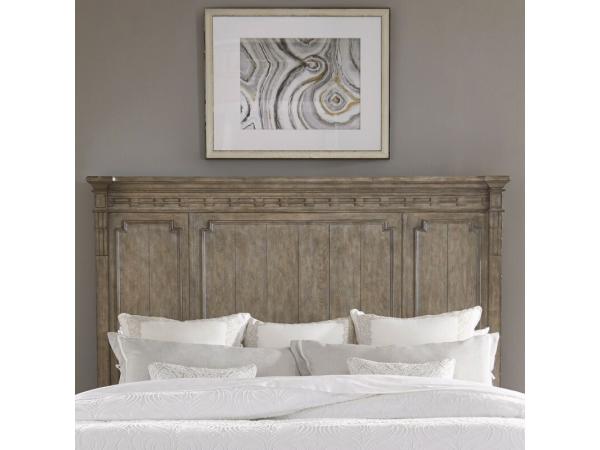 This king panel headboard, crafted from rubberwood solids and split heart oak veneers with a Dusty Taupe finish, features decorative fretwork accents and grooved panels for a timeless bedroom design.