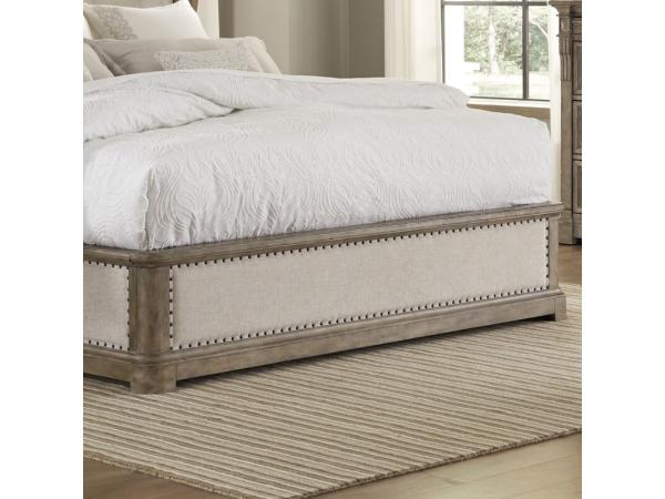 Crafted from rubberwood solids and split heart oak veneers with a Dusty Taupe finish, this queen upholstered panel footboard features a Cream Linen fabric panel with nail head trim for a timeless design.