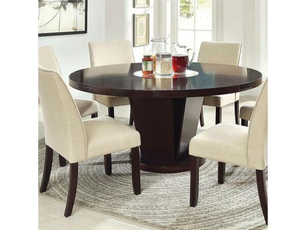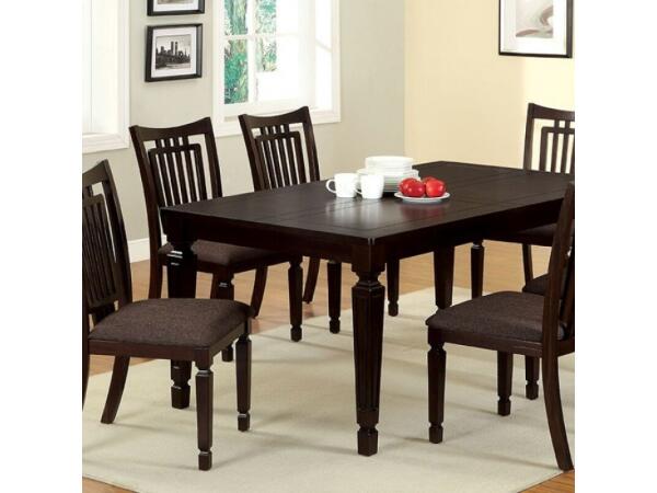 Update any dining room or kitchen with this transitional dining table and chairs. Finished in dark brown, the table has