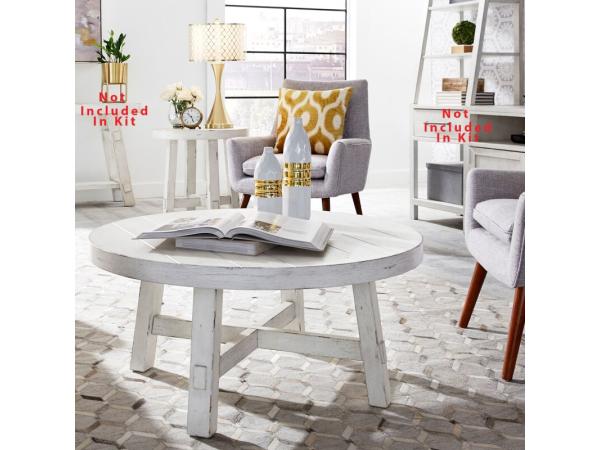 This Modern Farmhouse drum cocktail table features poplar solids with knotty white oak veneers and a flea market white finish with heavy distressing. It includes a high-low planked top and casters for easy movement.