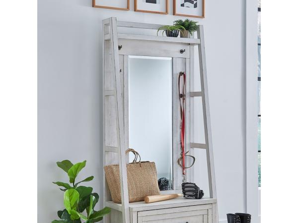 This Modern Farmhouse Hall Tree Top is crafted from poplar solids with knotty white oak veneers in a flea market white finish. It features a 1” beveled mirror, six heavy-duty coat hooks, and a top shelf for additional storage.