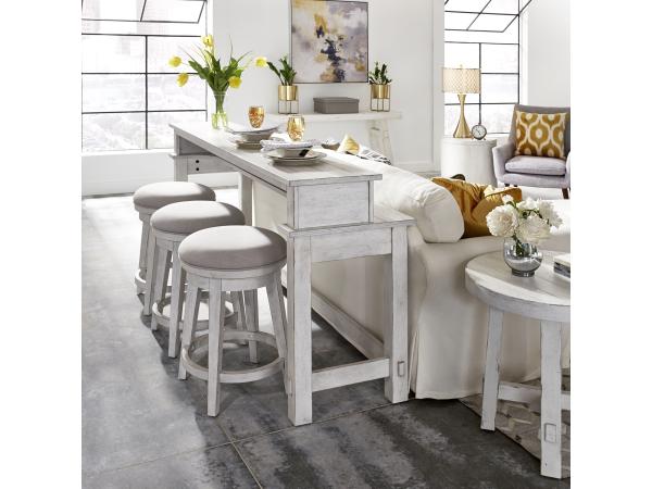 This Modern Farmhouse console bar table is crafted from poplar solids with knotty white oak veneers and a flea market white finish. It features a planked top, two plug receptacles, and USB ports for convenient charging, with space for three barstools.