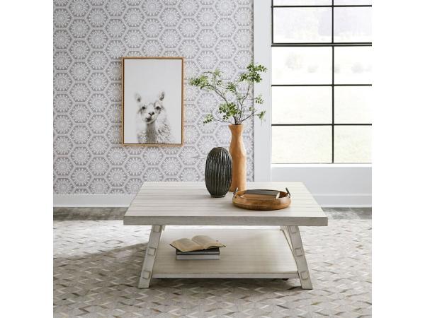 This Modern Farmhouse oversized square cocktail table is crafted from poplar solids with knotty white oak veneers and a flea market white finish. It offers a high-low planked top, a bottom shelf for storage, and casters for easy mobility.