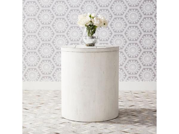 This Modern Farmhouse drum end table is crafted from poplar solids with knotty white oak veneers and a flea market white finish. It features a removable high-low planked top that conceals abundant storage inside.