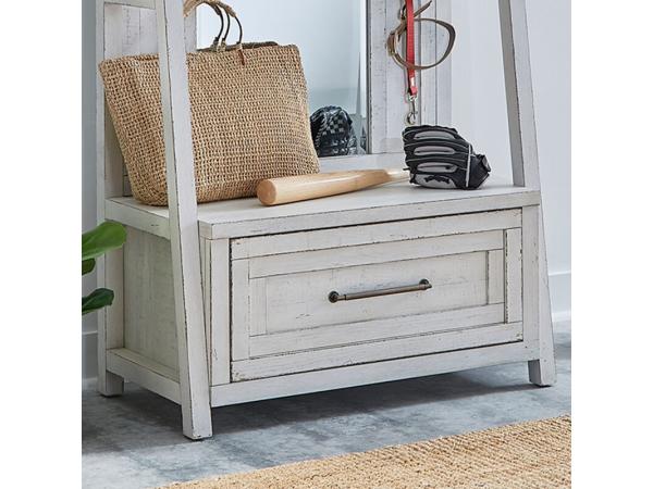 This Modern Farmhouse Hall Tree Base is crafted from poplar solids with knotty white oak veneers in a flea market white finish. It features a large full extension drawer with a unique high-low veneer pattern and washed brass bar pull hardware.