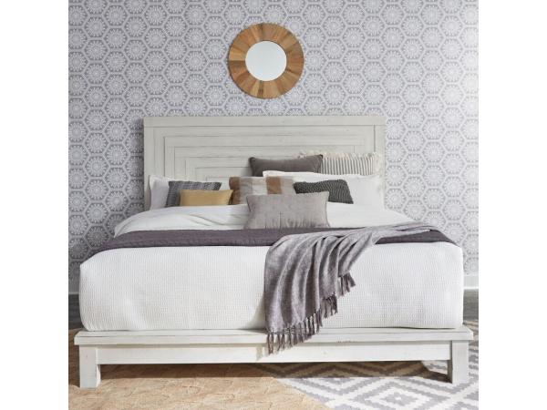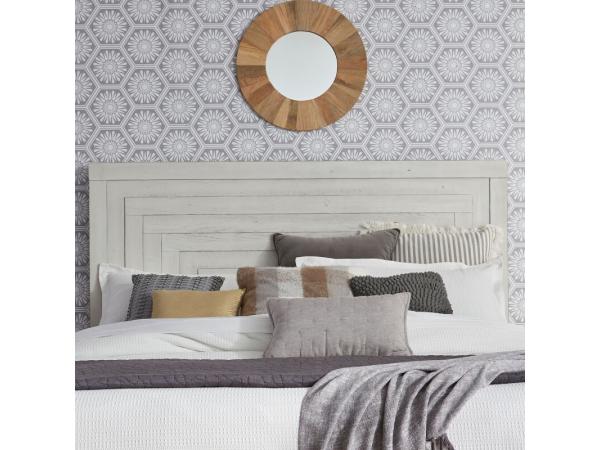 This modern farmhouse Queen panel headboard features a unique high-low patterned trim design. It is crafted from poplar solids with knotty white oak veneers and finished in flea market white with heavy distressing.