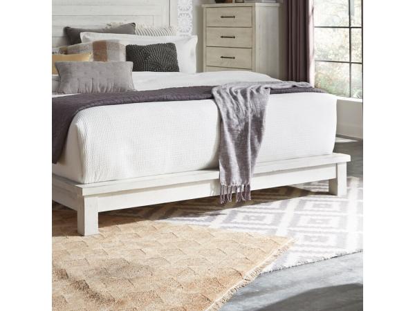 This Modern Farmhouse Queen Platform Footboard features a low-profile design with block legs. It is crafted from poplar solids with knotty white oak veneers and finished in flea market white with heavy distressing.