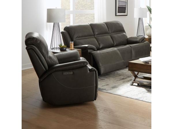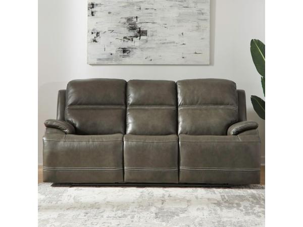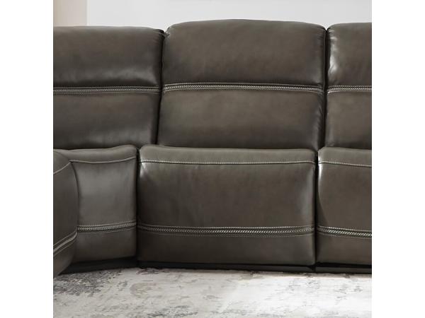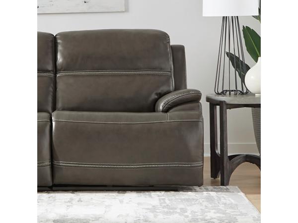 The Bentley sofa in Graphite Gray leather features dual power zero gravity recline with a power articulating headrest for optimal comfort. It offers bucket seating, a waterfall pad-over chaise for head-to-toe support, and USB-A and USB-C charging ports.