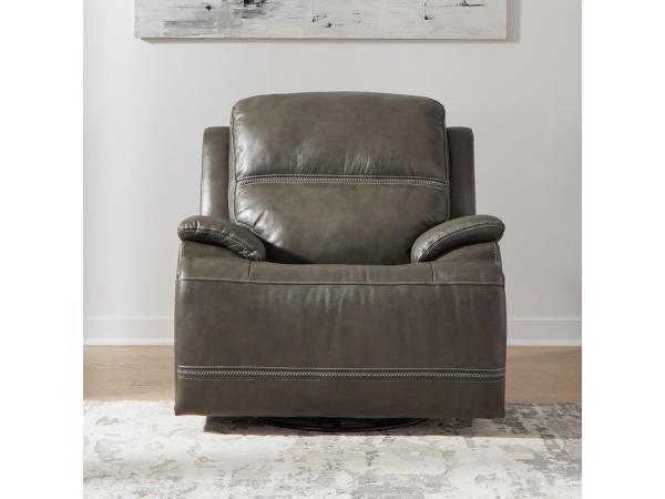 The Bentley swivel glide recliner features dual power recline, a power articulating headrest, and USB-A & USB-C charging ports for modern convenience. Crafted with semi-aniline leather in a graphite gray finish, it offers bucket seating for enhanced comfo