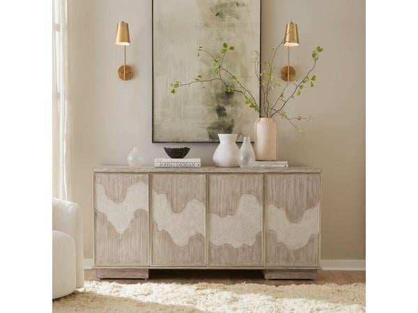 This Terrace accent cabinet, crafted from MDF and pine veneers with a Gravel finish, features four doors adorned with a unique winding river textured pattern. It offers ample storage with fixed wood shelves, European soft-close hinges, and wire management