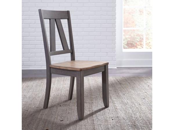 The Lindsey Farm splat back side chair is crafted from rubberwood solids with a gray and sandstone finish. It features an inverted V design on the chair back and a saddle-shaped seat for comfort.