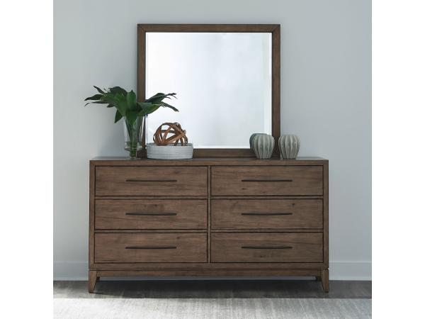This dresser and mirror set features dark bronze shaped bar pulls and a floating style base with angled tapered feet. The dresser offers premium utility with soft-closing drawers, felt-lined top drawers, and cedar-lined bottom drawers.