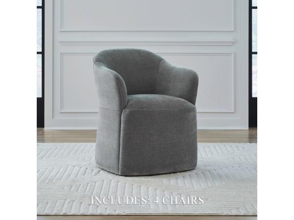 This versatile accent dining chair is fully upholstered in Sapphire fabric with pillowtop seat and back cushions. Equipped with casters for easy mobility, it functions well as a host, side, or accent chair.
