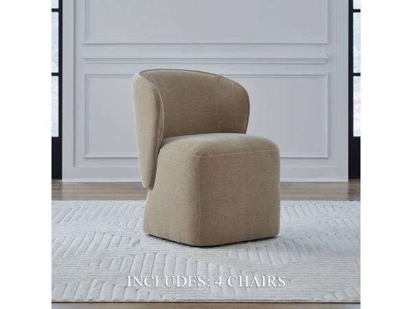 This elegant accent dining chair in Truffle fabric features gently sloping curves, an arched cap rail, and flared arms for sophisticated style. Equipped with casters for easy mobility, it functions perfectly as a versatile dining or accent chair.